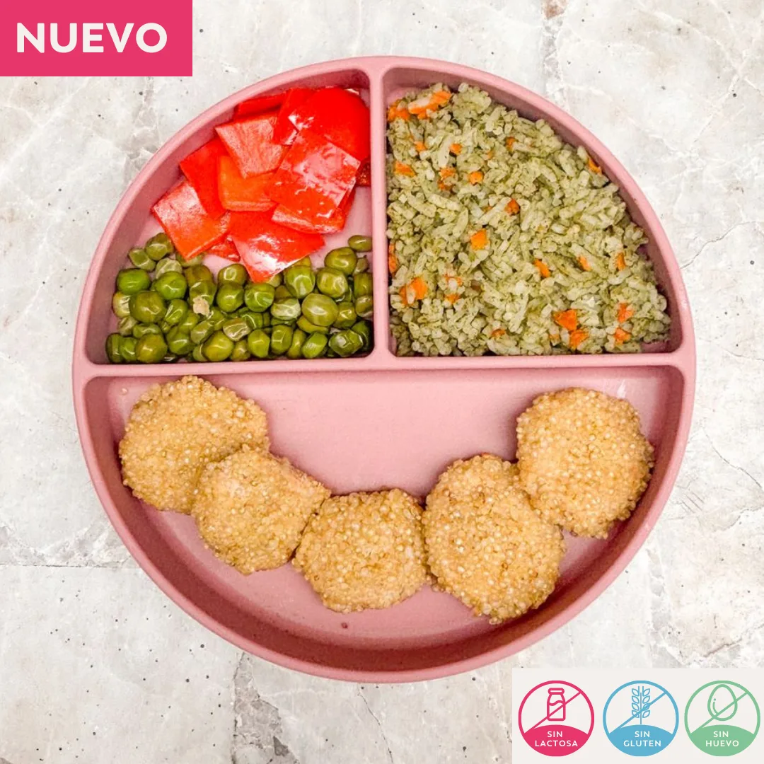 Arrocito verde casero con espinaca y zanahoria junto a deliciosos nuggets de pollo empanizados con quinua, acompañados de pimiento y arverja.