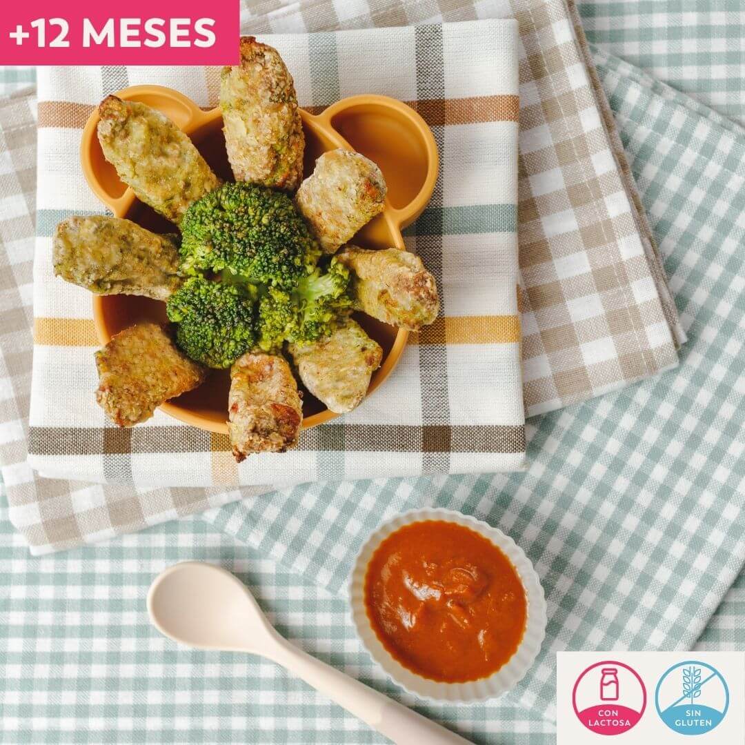 4 palitos crujientes de brócoli con queso mozarella y dip de tomate. ¡Sin gluten ni lactosa! Para niños a partir de 1 año.