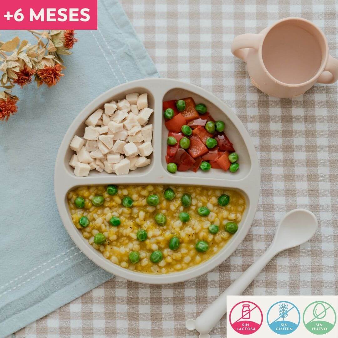 Plato completo con trigo meloso, pollo en cubos y vegetales frescos. Libre de sal, gluten, lactosa y huevo. Ideal para madres que priorizan la nutrición sin sacrificar el sabor. ¡Entrega en Lima!