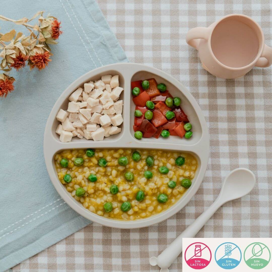 Plato tradicional peruano con trigo, pollo en cubos y vegetales. Libre de gluten, lactosa y huevo. ¡Sabor auténtico para niños que ya toleran sal!