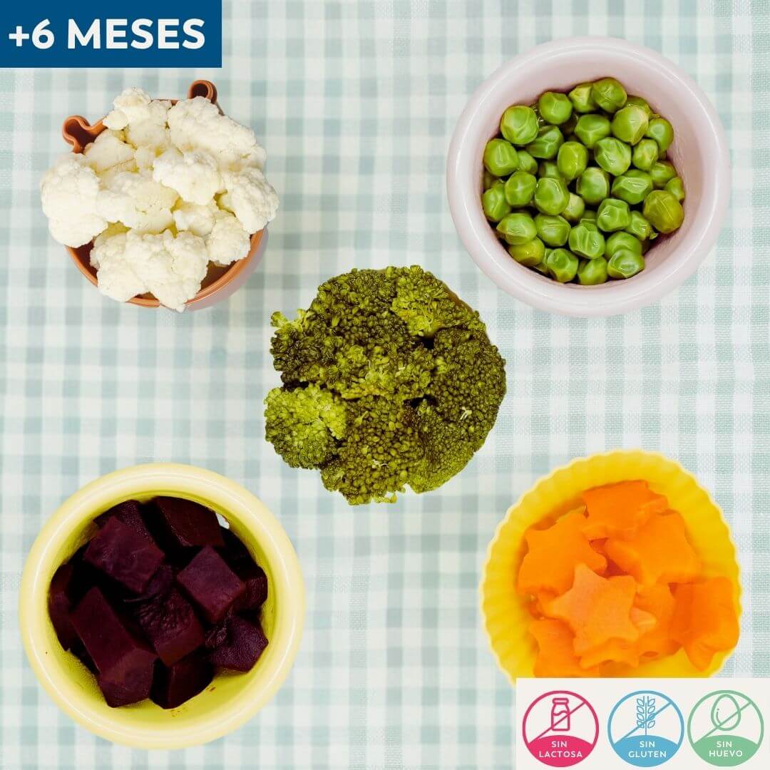 Pack de 10 verduras: 2 beterraga, 2 zanahoria en estrellas, 2 arvejas, 2 coliflor y 2 brócoli. ¡Sin gluten ni lactosa! Ideal para guisos y snacks.
